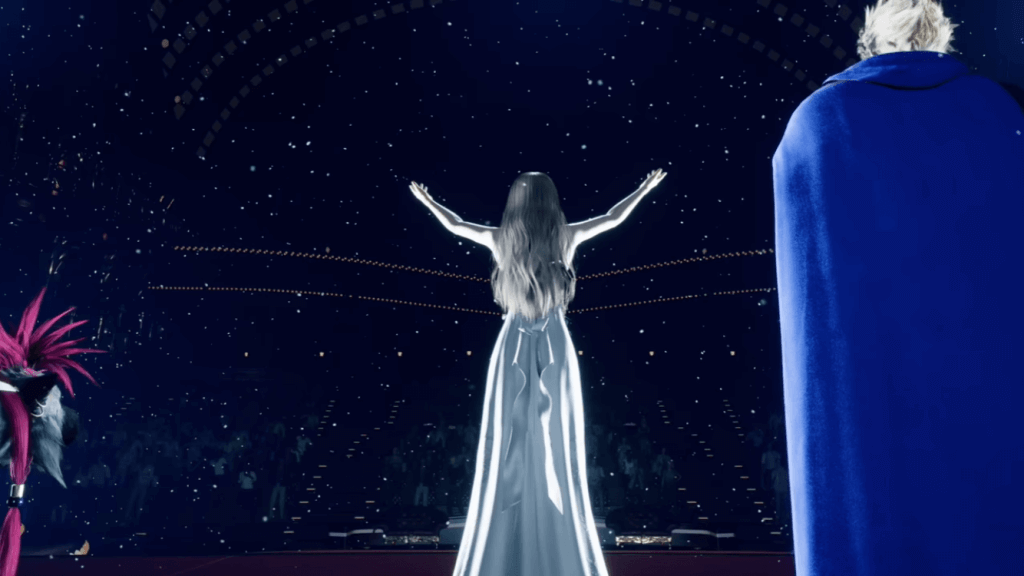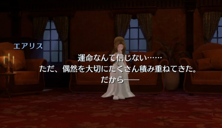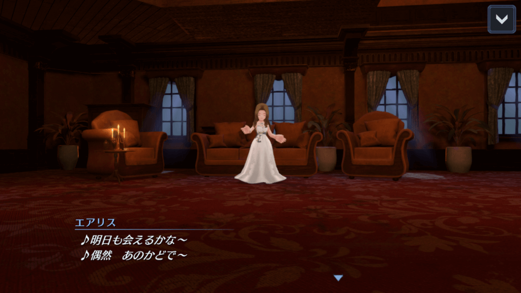 一人残ったエアリスは、出会ってからこれまでの想いを込めて歌うと心の中で誓う。クラウドの呼びかけに応じて舞台に上がり、優しくも力強い歌声を響かせるのだった。