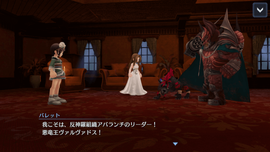 ユフィは「迫力のあるヴァルヴァドス役はバレットしかいない」と挑発し、バレットはいやいやながらも演じることに。